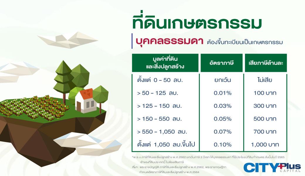– สำหรับเจ้าของที่เป็นบุคคลธรรมดา หากมีที่ดินทำการเกษตร มูลค่าไม่เกิน 50 ล้านบาท จะได้รับยกเว้น ส่วน ที่ดินที่มูลค่าเกิน 50 ล้าน